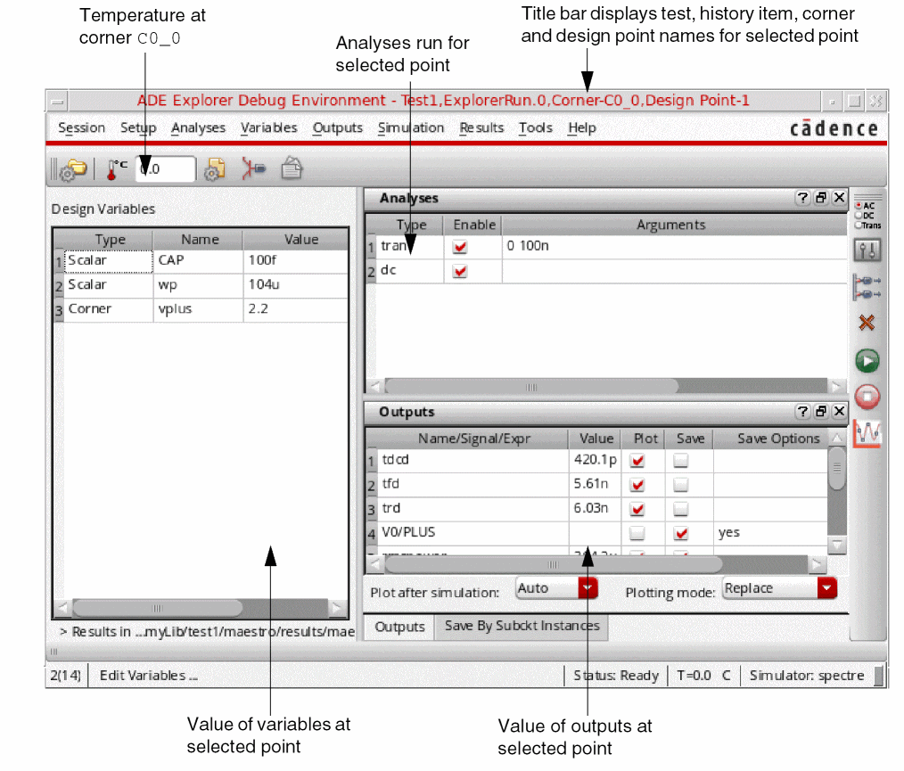 The ADE Explorer Debug Environment window title bar displays the test name, history item name, corner name and design point ID for the selected point. For example, the title bar in the above figure displays the point information as: