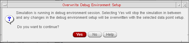 - If you try to open a debug environment for a point while this environment is already open for another point, the set up of the previous point is replaced with the new point. However, if a simulation is already running for the previous point, the following confirmation message is displayed. Click No to continue with the simulation already running.