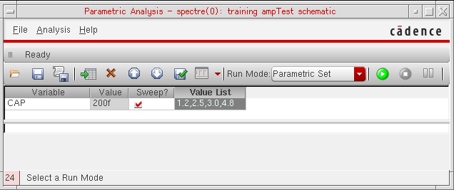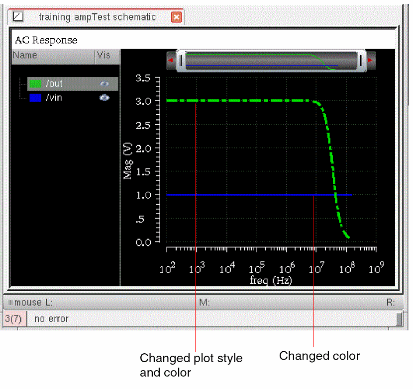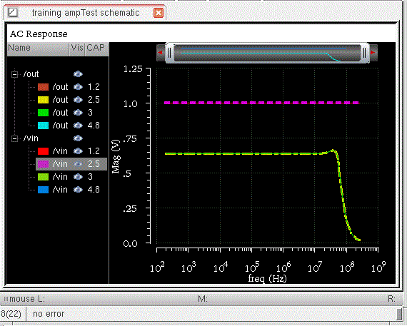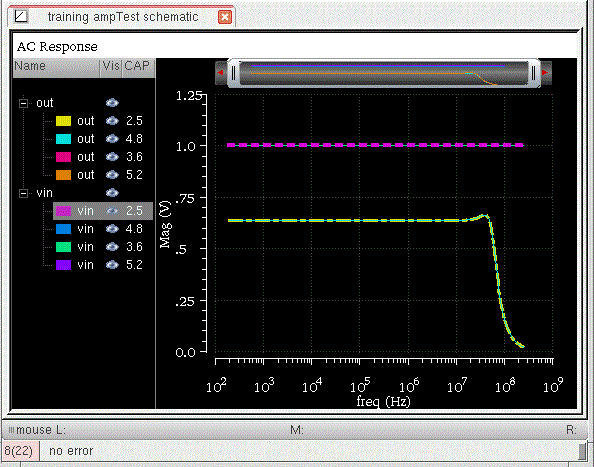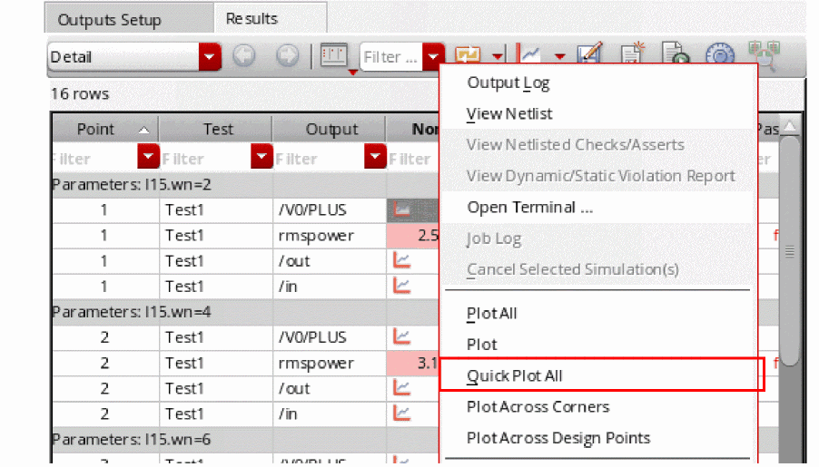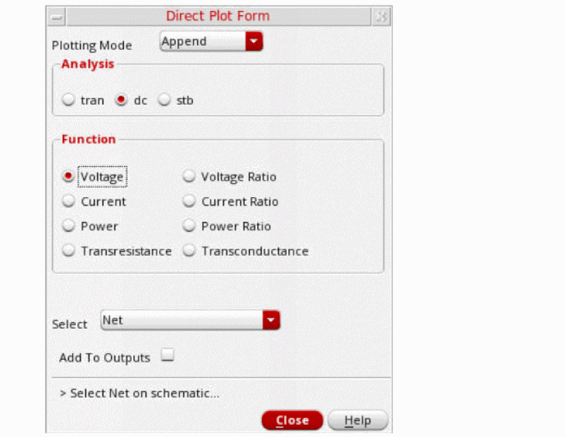 - In the ADE Explorer window, use the Outputs – To Be Plotted – Select On Design command to select nets and terminals in the schematic. Use commands in the Results – Plot Outputs menu to display the graphs for the selected analysis type.