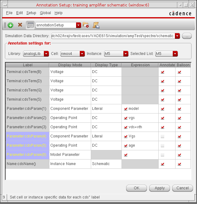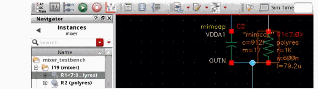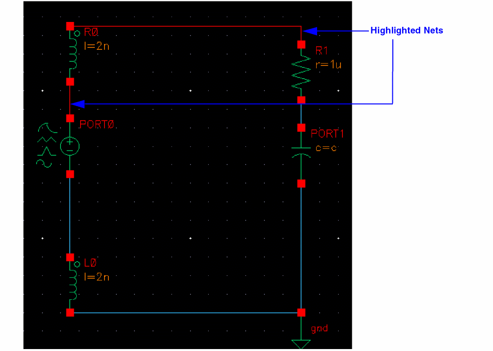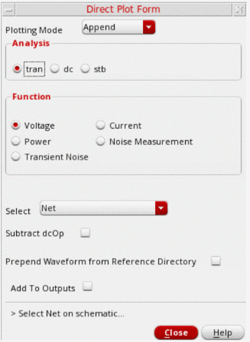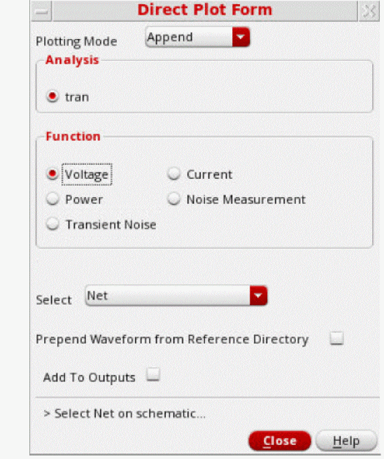 - In the ADE Explorer window or in the schematic, use the Results – Direct Plot command to select nets and terminals in the schematic and to plot a function immediately.