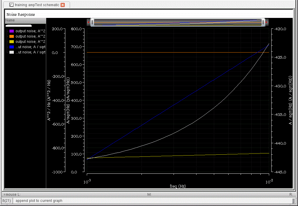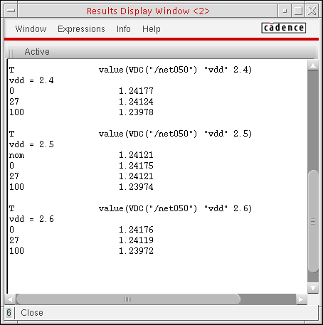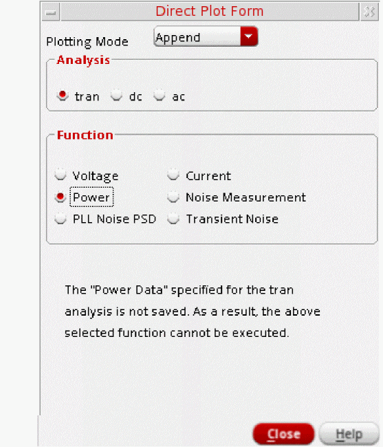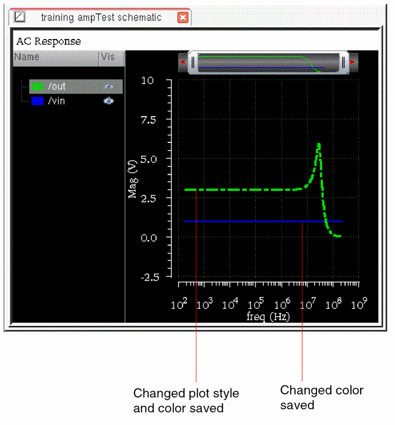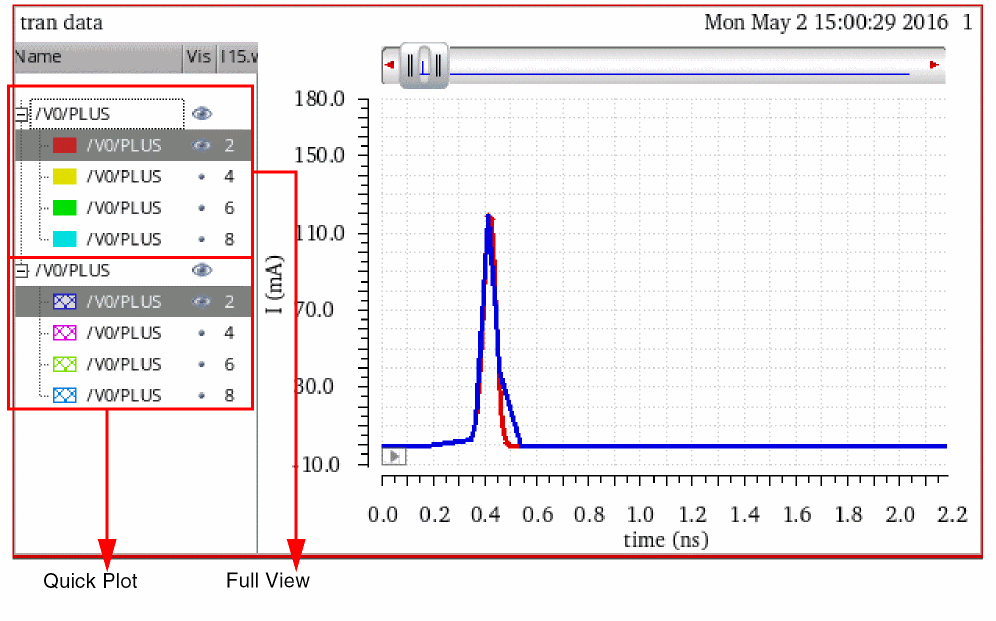 Plot the results by updating the existing graphs in the Virtuoso Visualization and Analysis XL graph window that is already open. Use this option when you want to save and reapply graph and trace settings on the plots that you want to review across different simulation runs.