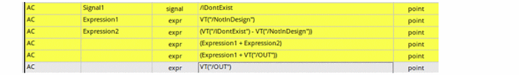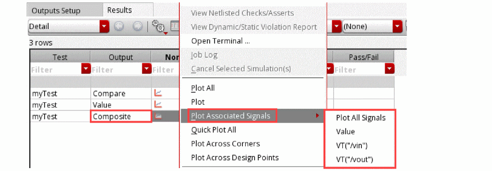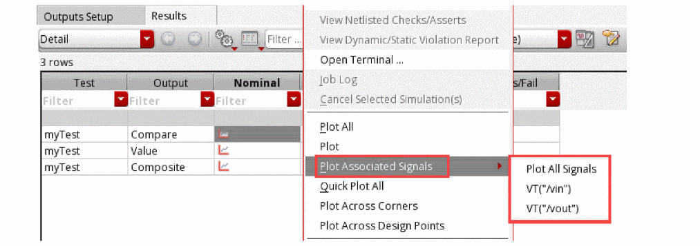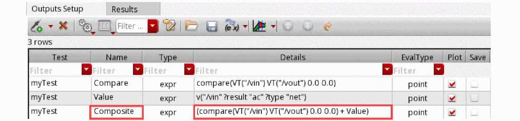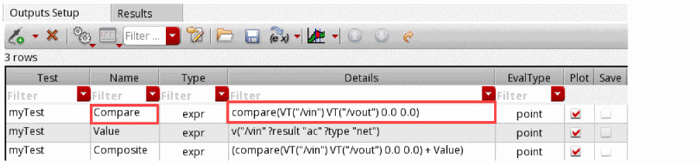 On the Outputs Setup tab, consider the Compare expression, which compares two waveform signals: VT("/vin") and VT("/vout").