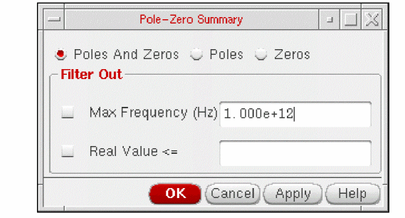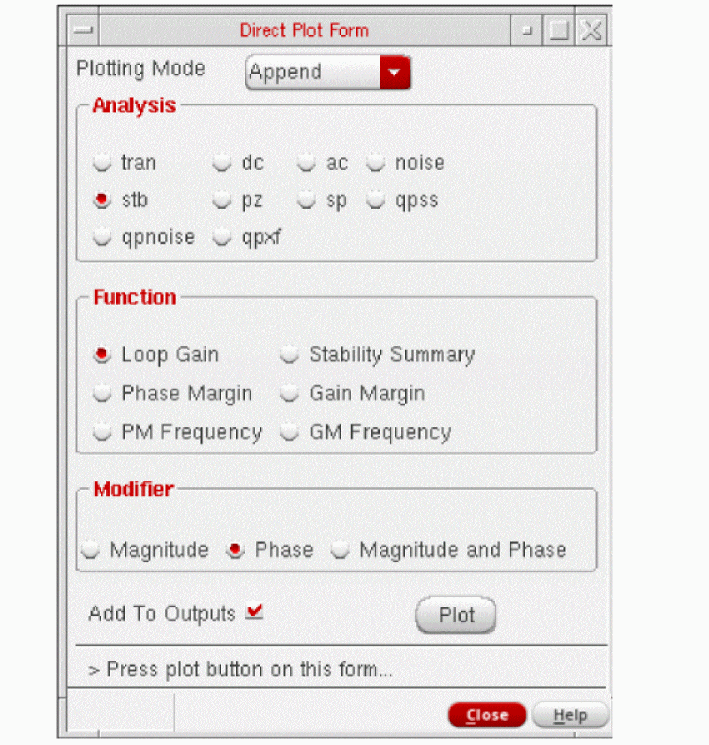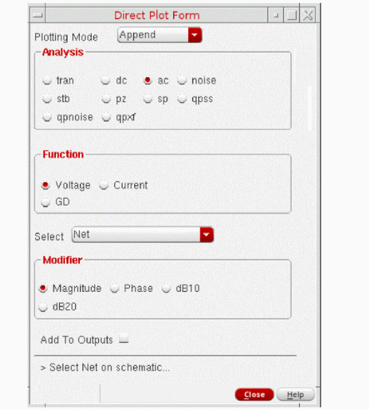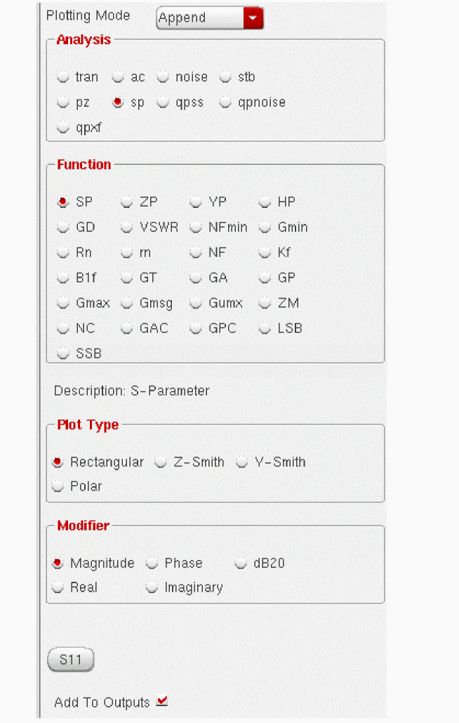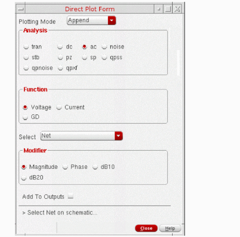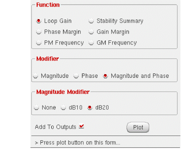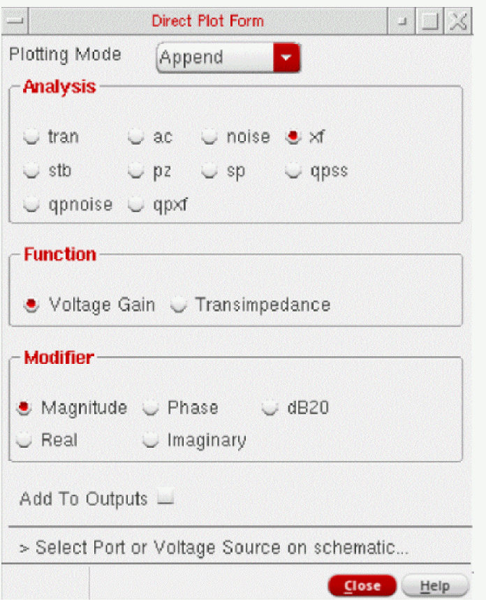 Modifier , which is used only for rectangular plots, specifies the modifier the analog circuit design environment uses to reduce complex data for two-dimensional presentation. Option availability depends on the selected function; some functions, such as stability factor, do not require a modifier.