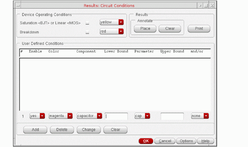 These checkboxes let you highlight components in saturation and in breakdown. When the Annotate Place button is pressed, components in breakdown, saturation, or both are highlighted on the schematic with a colored box. The color of the box is chosen by the color cyclic field next to each field.
