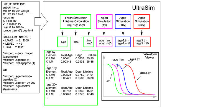 Figure 10-1 shows the reliability simulation flow. The input is the SPICE netlist file, in addition to reliability control statements, degradation parameters, and one of the following reliability model options: Aged SPICE or AgeMOS model parameters.