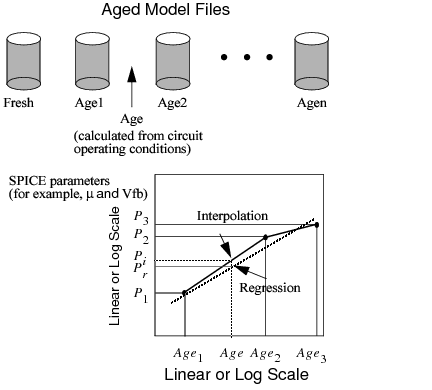 The aged model is an extension of the traditional SPICE model for HCI, NBTI, or other age models. Aged SPICE model parameters are extracted from a fresh device at a number of stress intervals. These model parameters form a set of aged model files. Each file represents the transistor behavior after certain degradation, such as hot carrier stress. The amount of stress is given by the