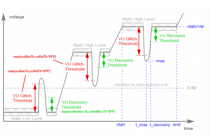Reports the condition if device voltages are out of bounds for a duration of time longer than dtime (dtime default value is equal to the minimum time step of the simulation). |