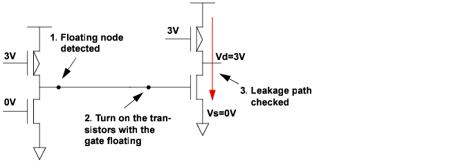 Reports MOSFETs with channel connected directly between VDD and GND. |