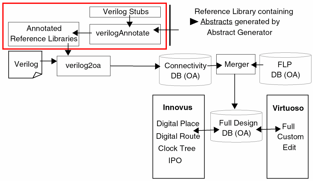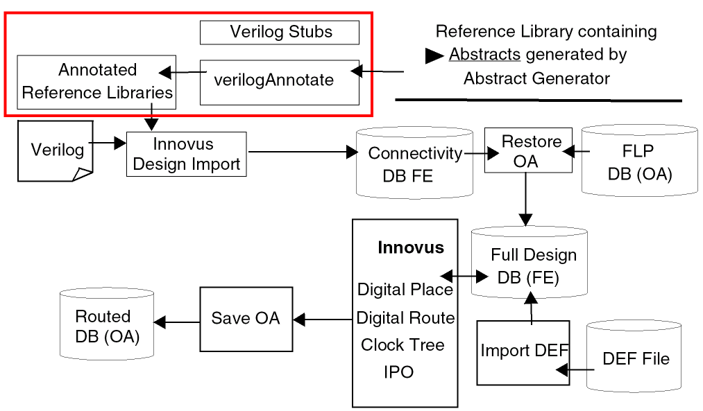 For this flow to work, run Verilog Annotate on the library elements before data is used in Innovus. The verilogAnnotate annotates the vector bus terminal information on the OA cellview of the library element. Running verilogAnnotate requires a corresponding interface definition in verilog format of the module corresponding to the library element. For each library element, a verilog stub file is created as described in the following figure. The verilog stub file is created from corresponding schematics and symbol definitions by using theverilogAnnotate is a time consuming process.