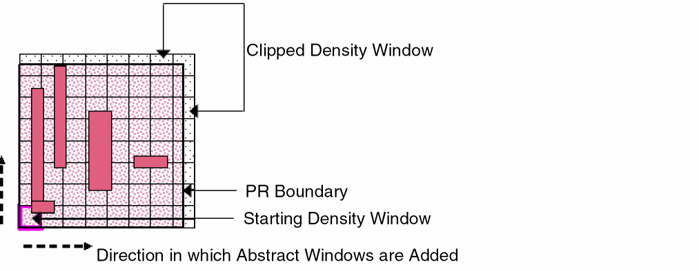 Starting from the lower left corner of the bounding box of the PR boundary, the abstract is divided into a rectangular grid with window size as specified in the GUI. The rectangles intersecting the PR boundary are clipped at the right and top sides. Therefore, the size of the density windows at the right and top sides will be smaller than the size specified for the density window in the GUI. This is shown in the figure below.