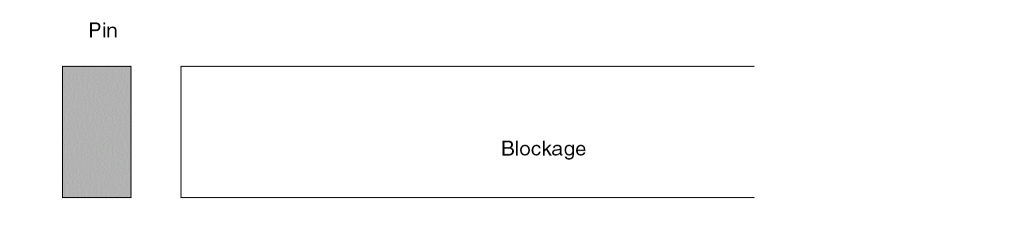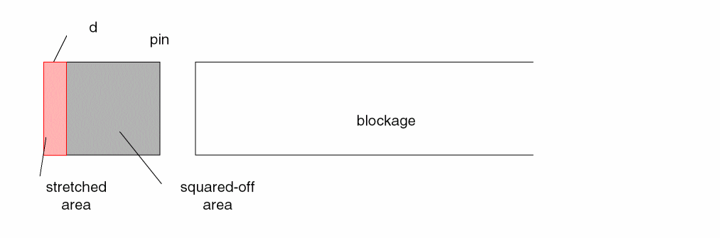 When the Create boundary pins option is selected, Abstract Generator first squares off the pin to the right, maintaining the existing left boundary and adjusting the right boundary (the darker hatched area). Then, because distance ‘d’ is too small to accommodate a visible spaced blockage, Abstract Generator stretches the pin back to the boundary (the lighter hatched area).
