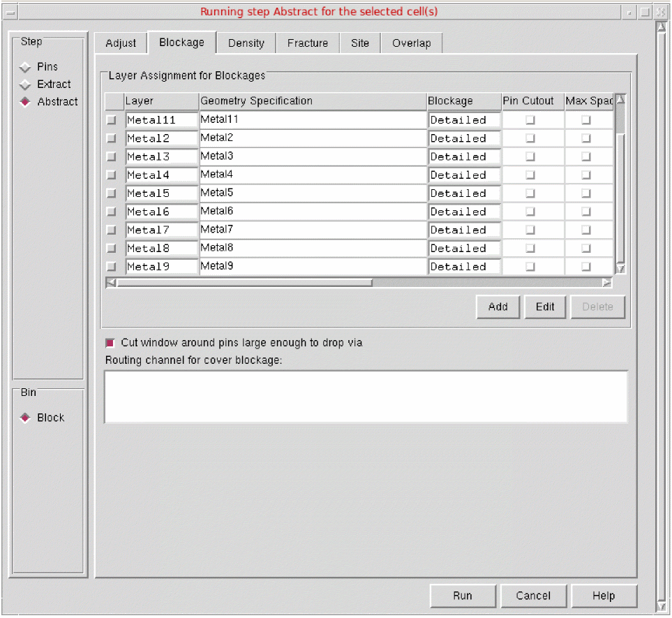 - Use the Layer Assignment for Blockages table to specify how blockages are to be modeled in the abstract.