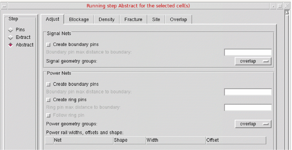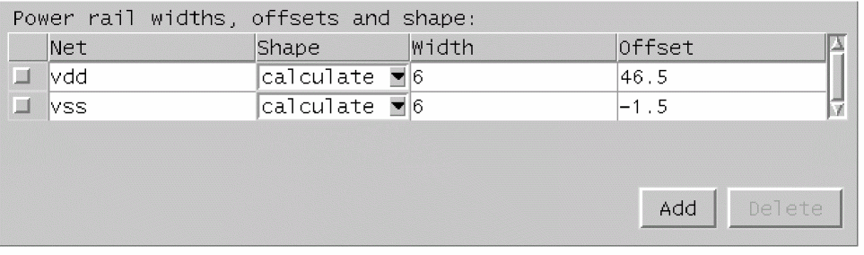 If the Power rail widths, offsets and shape option is set to feedthru, abutment or none, Abstract Generator will only use the specified values to set terminal properties. That is, if only one power rail net is entered into the table, that will be the only rail used to set terminal properties.