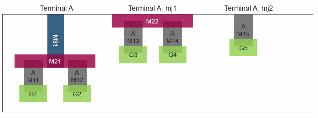 To calculate the antenna numbers of MUSTJOIN terminals, in the Extract step, Abstract Generator identifies disjoint groups of shapes extracted for nets in the layout. It then renames these terminals and sets the MUSTJOIN attribute on these terminals.