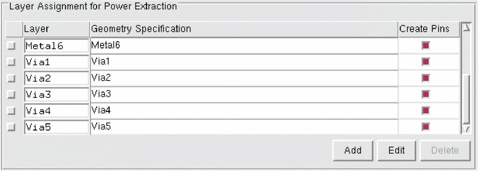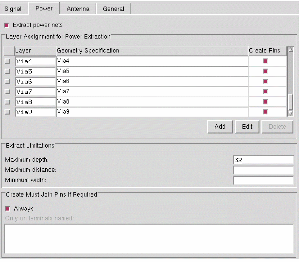 Power net extraction for large blocks can often be slow if pins are created on via layers. This is partly due to the large number of via pins that can be created. If power net extraction takes too long, abort the run, re-extract and do not create pins on via layers. - Use the Add, Edit, and Delete buttons and the G-Spec Builder Form in conjunction with the operators to work with the Layer Assignment for Power Extraction table.