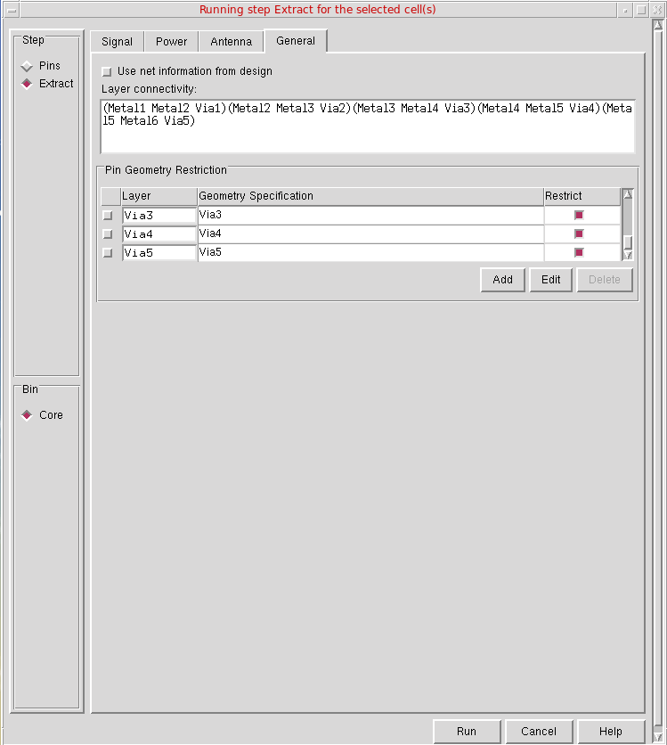 You can use the Running step Extract form to extract geometries on signal or power nets or to calculate process antenna information. You can specify connectivity information in a design using the General tab in the Running step Extract form.