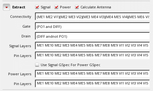 - Select Gate and Drain text boxes to assign layers to antenna regions to identify the gate and drain regions and to enable antenna calculation.