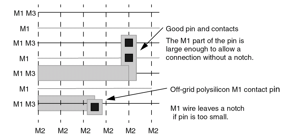 Routing problems can be caused by incorrectly defined on-grid pins. These problems are sometimes referred to as off-grid problems. The router and verify geometry (in Innovus) do not consider a notch a violation. These violations are found by the samenet check.