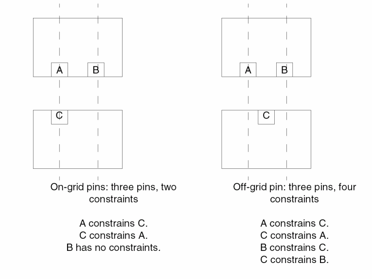 The more constraints there are, the harder it is for the router. The following figure shows how one off-grid pin increases the number of constraints.