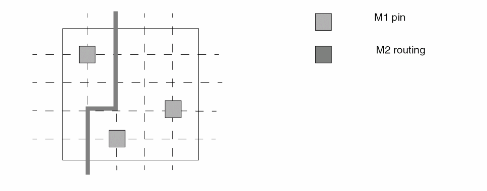 Special care should be taken not to block access to pins through vias. For example, avoid M2 geometries too close to a M1 pin such that M1 to M2 via cannot be dropped in order to access the pin on M2. -