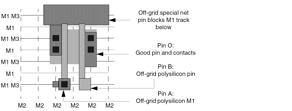 Pin A has several off-grid shapes and one on-grid shape. Pin B has two off-grid polysilicon pin shapes. Pin O has one on-grid shape. The off-grid shapes slow down the router and lead to inefficient routing. Further, if the spacing rules for this example did not allow M1/M2 vias to be placed on pin A, the router would not be able to connect to Pin A. This could result in an inefficiently routed design.