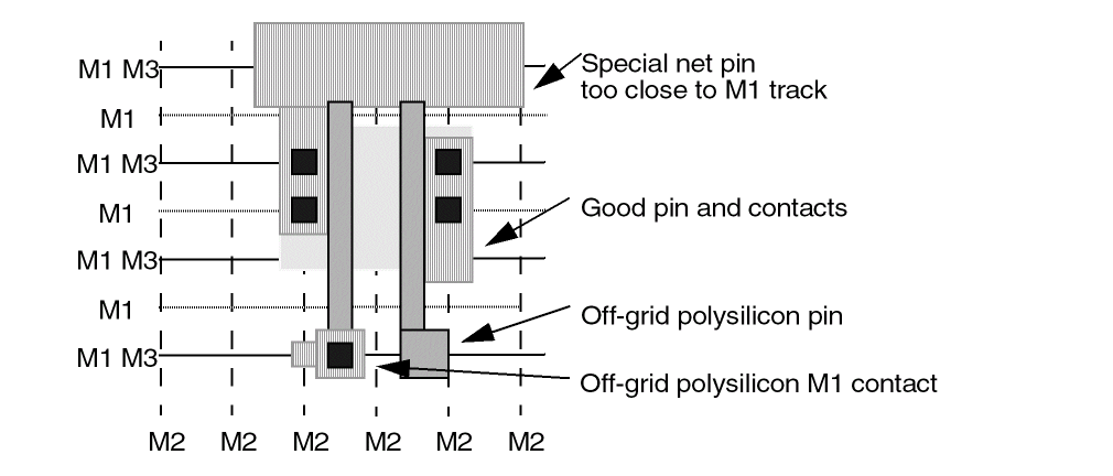 If off-grid pins exist, and the router has been set to allow off-grid pins, then grids are created by the router. Any pin that does not cover the routing grid with enough area to place a via is considered off-grid, and a track is created through the center of the pins. Off-grid tracks will slow the router by requiring more memory. Routing is slower because wires on each off-grid track interfere with adjacent on-grid routing. -