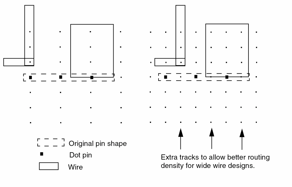 - The design on the left shows the closest that wide wires can be placed using the normal, expanded line-to-via routing pitches.