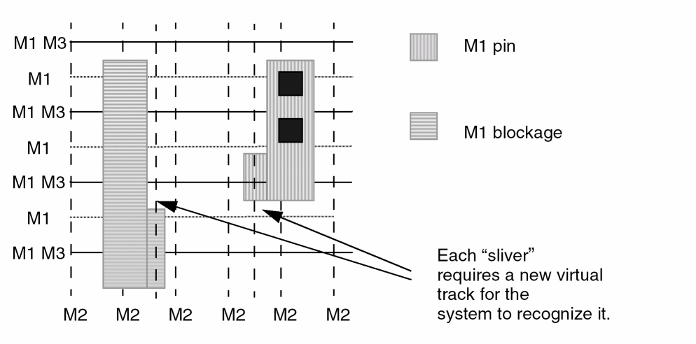 Certain libraries require the creation of thousands of virtual tracks because of the presence of off-grid geometries, which must be avoided during routing. The following figure shows virtual tracks in use.