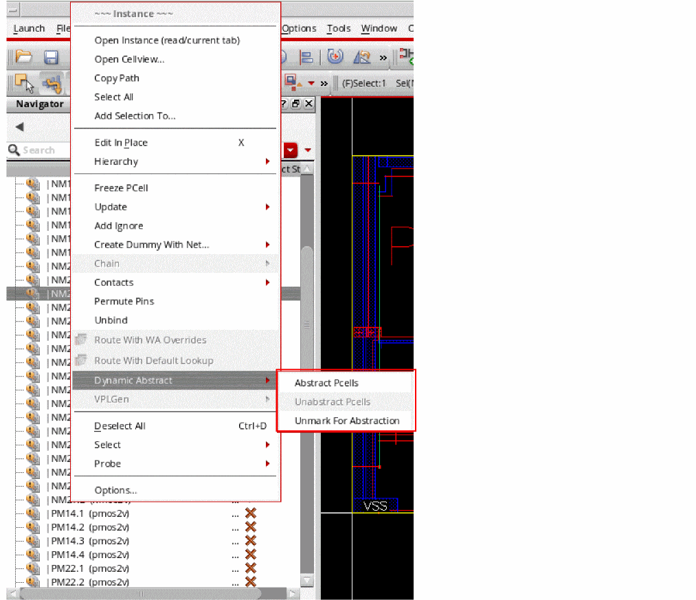 Depending on the abstract status of a Pcell, the context-sensitive menu provides the Dynamic Abstract commands for Dynamic Abstract Generation. For example, if a Pcell displays the abstract status as Dynamic Abstract does not exist, the context-sensitive menu for the Pcell contains commands for to unmark the Pcell for abstraction, abstract the Pcell, and unabstract the Pcell, as shown in the figure below.