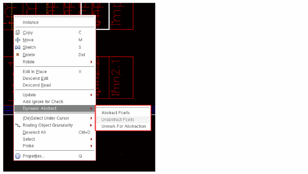 You need to select a Pcell in the layout canvas to view the context-sensitive menu. The Dynamic Abstract submenu that is available on the context-sensitive menu contains commands that can be used for Dynamic Abstract Generation. Right-click a selected Pcell to view this menu, as shown below.