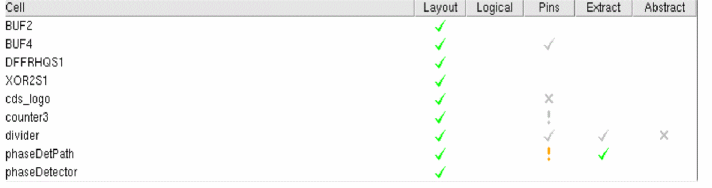 The first source of result evaluation comes from the Cell Pane in the main window. Abstract Generator uses color-coded symbols in the Cell pane to indicate the result of a particular abstract generation flow step. A color-coded symbol against a cell corresponding to a particular step indicates if the step completed without problems or whether warnings or errors were generated during the step.