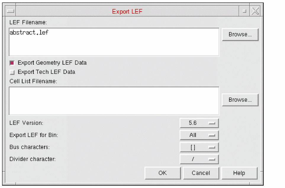 - Select Export Geometry LEF Data and Export Tech LEF Data to choose the combination of geometry LEF and technology LEF to be exported. All the LEF information is written to the specified LEF file name.