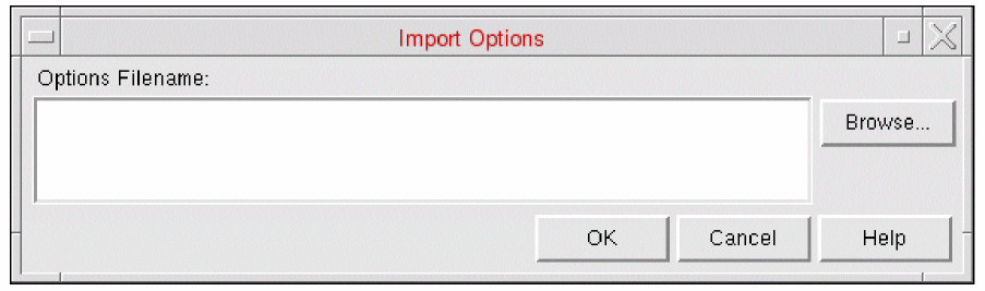 The Import Options form allows you to load an options file saved in a previous session. You can save the settings of a session and load these settings back when you start a new session using the Import command.