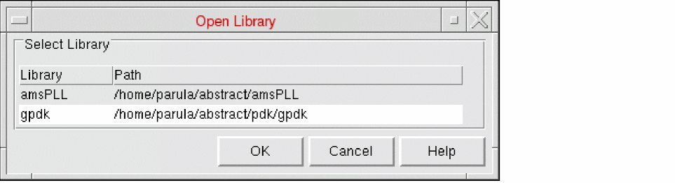 The Open Library window lists the libraries and their associated paths that are currently registered in Abstract Generator. These are read in from the cds.lib file located in the run directory and are listed in an alphabetical order. The cds.lib file defines the libraries that tools read to identify the libraries they can use. The file maps user library names to physical directory paths. Usually, one cds.lib file, which might reference other cds.lib files, determines the libraries that are available to your design tool.