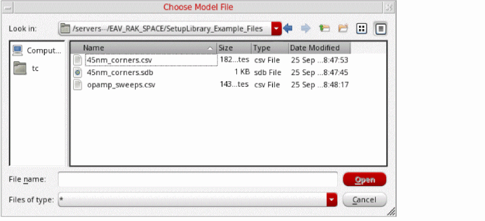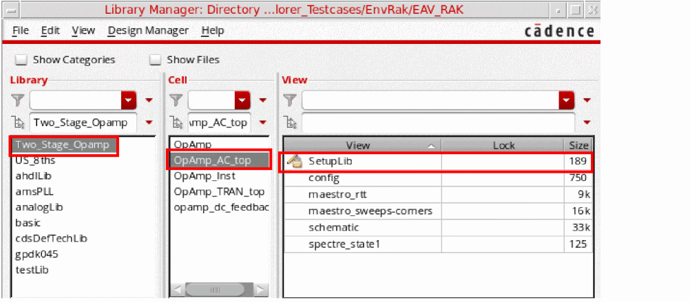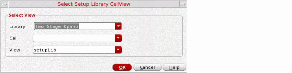 The new Setup Library cellview you create is saved and displayed in the View section of Library Manager. For example, if you create a new cellview SetupLib for library Two_Stage_Opamp and cell OpAmp_AC_top, this cellview is displayed in the Library Manager window.