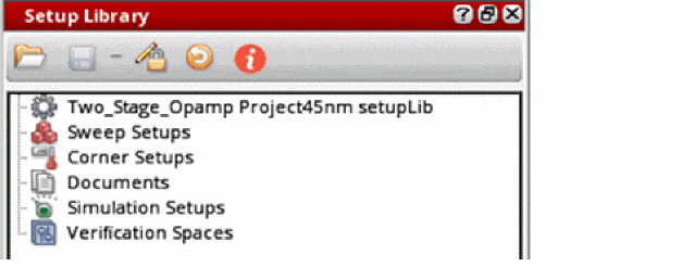 The Setup Library assistant helps you define a project-specific (master) setup for the design blocks in ADE Assembler and then reuse the specified setup to create or modify the current simulation setup in the Data View assistant. The setup in this assistant is generic and can be applied on any design. The Setup Library assistant can be accessed using ADE Assembler and ADE Verifier.