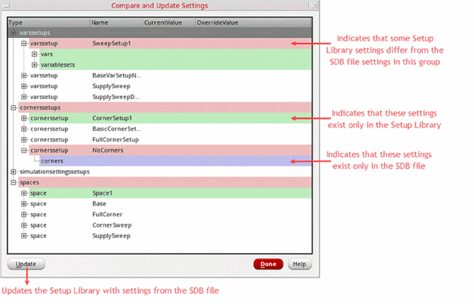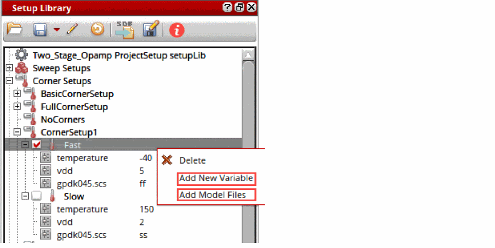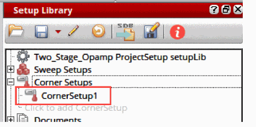 - Add the corner in the ADE Assembler Setup that uses the same Setup Library cellview. See Adding New Corner Setups.