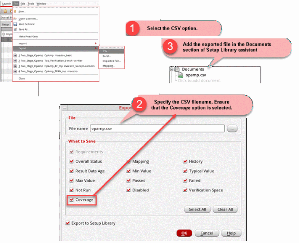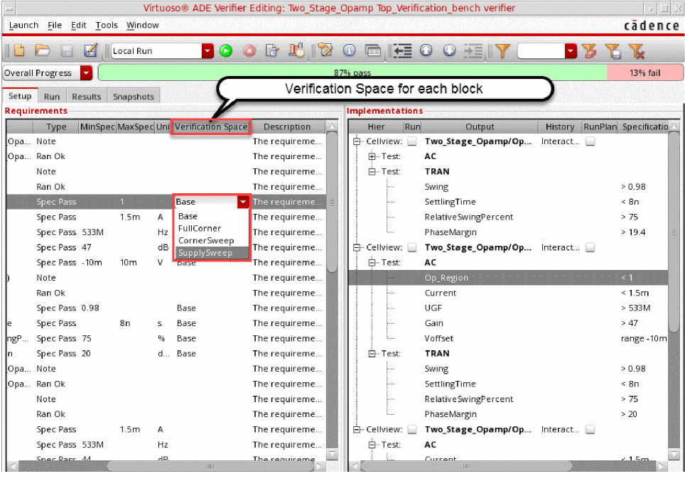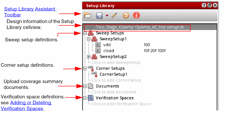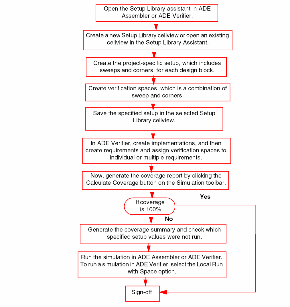 Once the setup is created and saved in a Setup Library cellview, you can open the cellview in ADE Verifier and calculate the coverage to check the completeness of the project setup requirements.