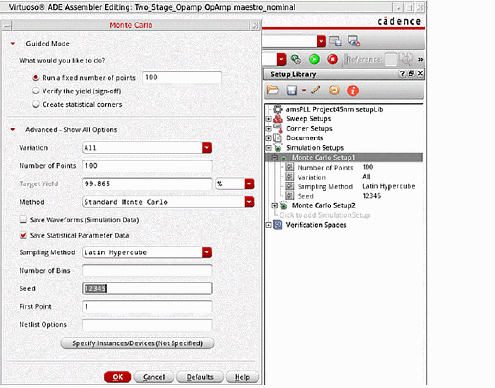 The setup contains the variables Number of Points, Variation, Sampling Method, Seed, Netlist Options, and Reliability Mode.