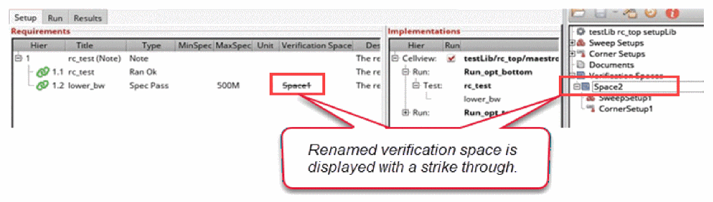 The Verification Space column on the Run tab displays the verification space specified for the implementation. This column is read-only. You can edit the verification space in the Setup tab.