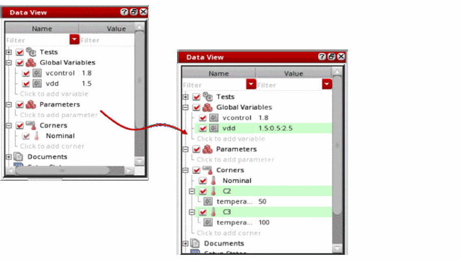 - After you run the simulation and open the updated cellview in ADE Assembler, the sweeps and corners from the selected verification space are merged with the sweeps and corners in Data View in ADE Assembler.