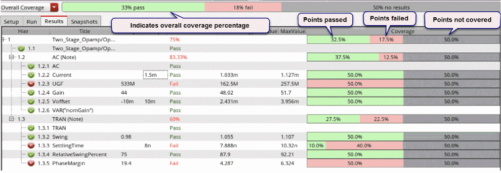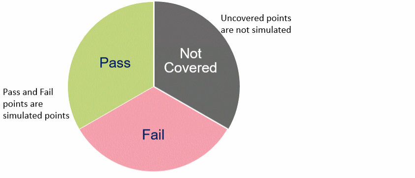 The simulation results can include the pass and fail percentage of all the points that have been simulated during the simulation runs. When the coverage is generated in ADE Verifier, it calculates the percentage of points that are not simulated.