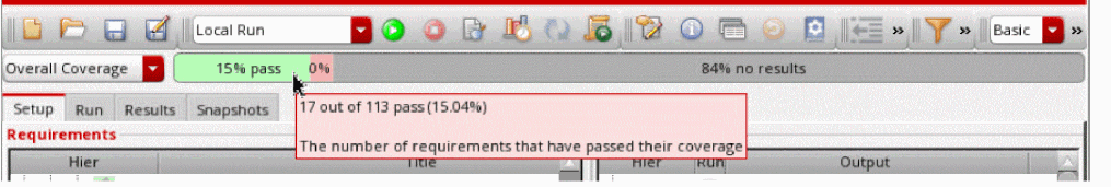 You can also view the Overall Coverage in a progress bar on the Setup tab. The following illustration shows the number of requirements that have been successfully covered in the verification: