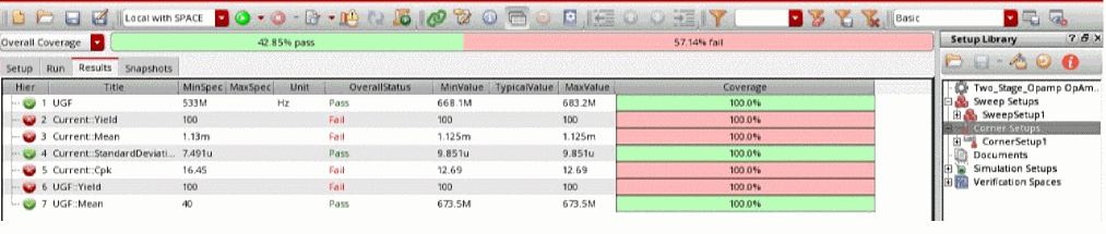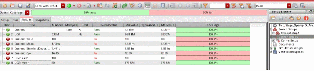 For example, if the specifications include 250 corners and only 100 of them are simulated, you get the coverage of 40% on the given design. This indicates that 60% of the corners have not been run, regardless of the number of outputs passing the specifications.