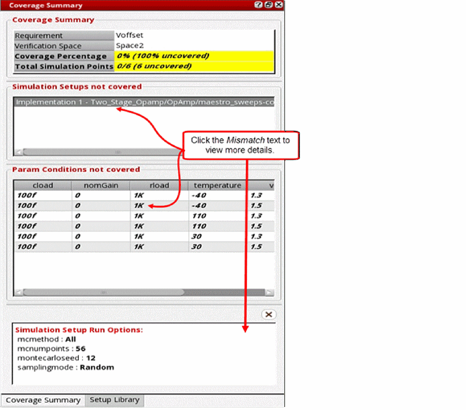 Mismatch, is displayed that you can click to view more details. - The Simulation Setups not covered section displays a list of only those implementations whose simulation settings do not match with the simulation settings of the verification space. The values that are a mismatch are displayed in bold. In addition, you can click the text in bold to view more details on the simulation setup variables.