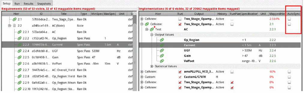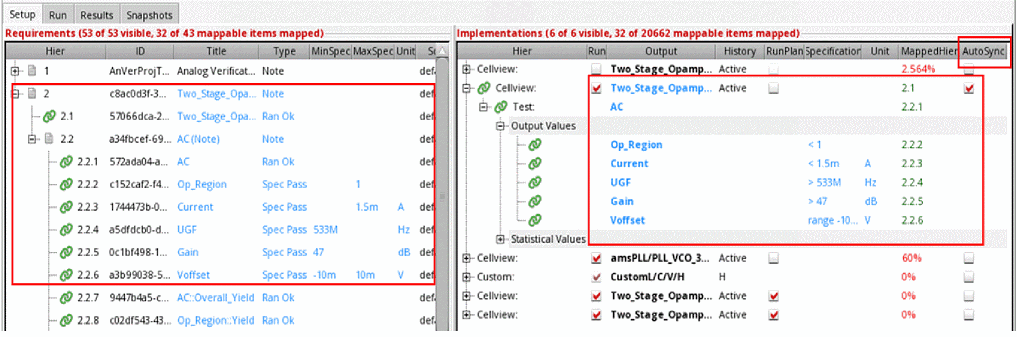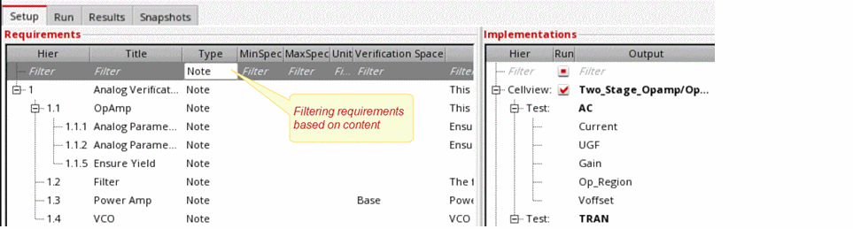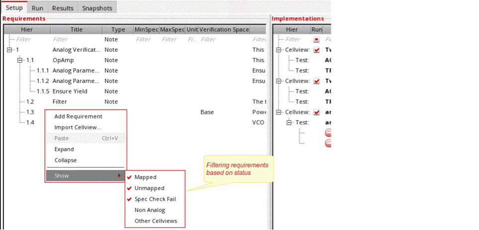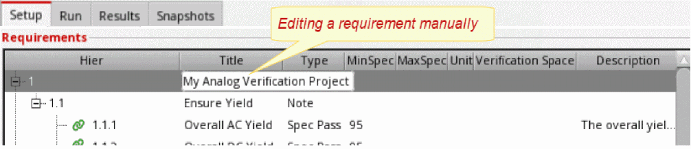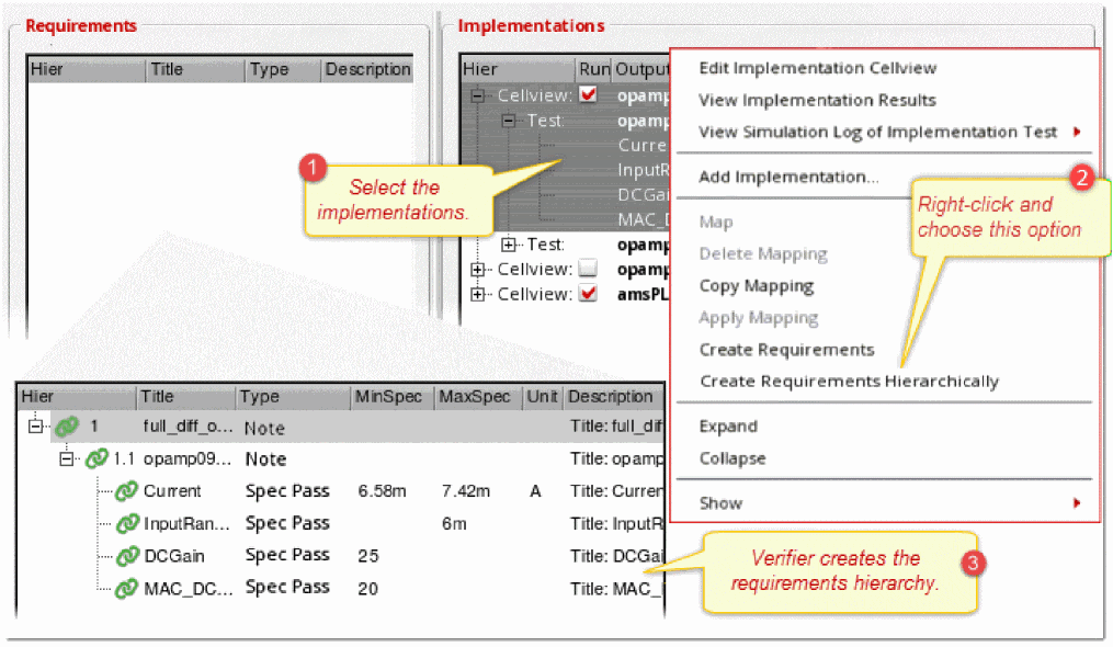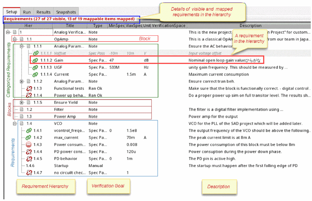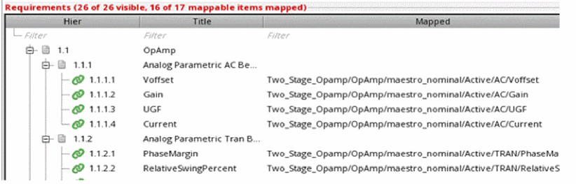 Requirements are central to a design verification flow implemented using Virtuoso ADE Verifier (Verifier). Requirements form the hierarchical verification plan of your design verification project. You map requirements to their implementations. Verifier determines the verification status of the requirements using this mapping information, along with other settings and results. For details on implementations, see Implementations and Mappings in Virtuoso ADE Verifier