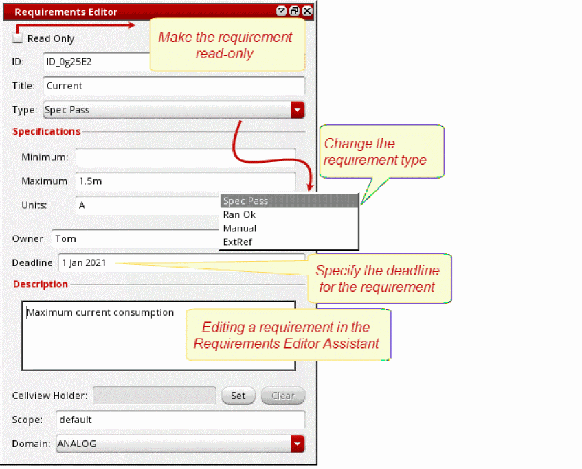 - Add the requirement details in the Requirements Editor. See Adding Requirements using the Requirements Editor Assistant.