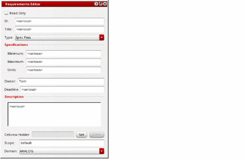 Specifies the owner of the requirement when multiple people are involved in the design verification project. You can specify a list of comma-separated owners for a requirement. The current user is the default owner of the new requirements you add in the Verifier session. For details, see External References in Virtuoso ADE Verifier. |
