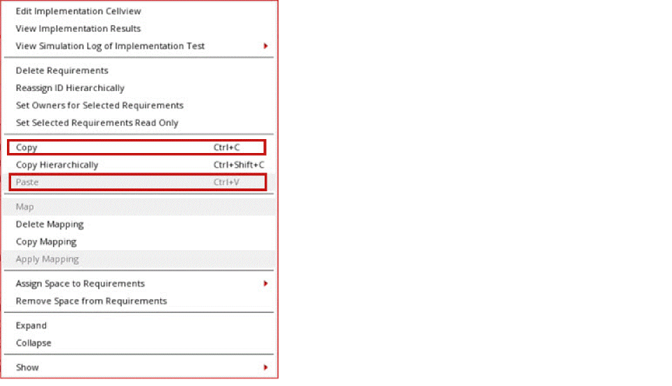 Shortcut Menu Options in the Requirements and Implementations Pane