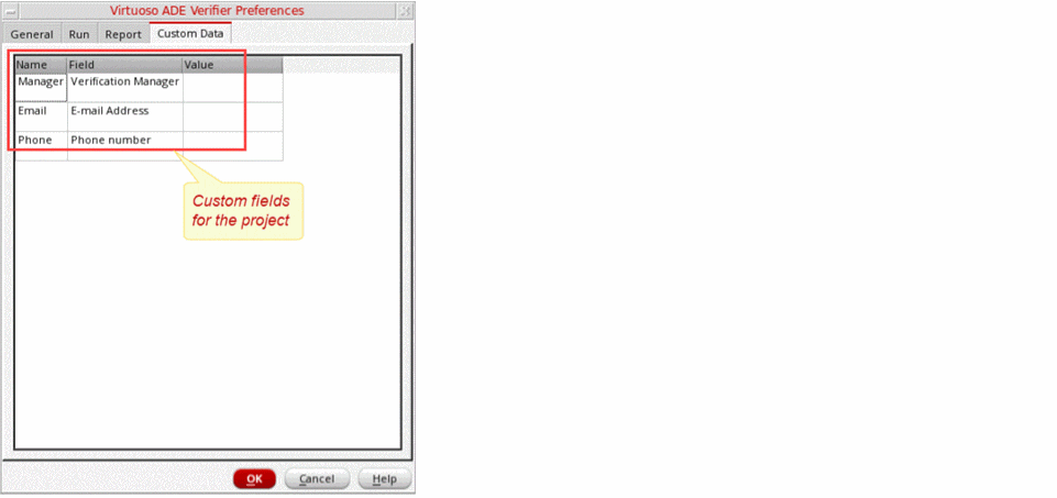 After you set up Verifier, the custom fields become available to the Verifier sessions. The custom project fields are available in the Custom Data tab of the Change Referenced Cellview Form. The custom requirement fields are available in the